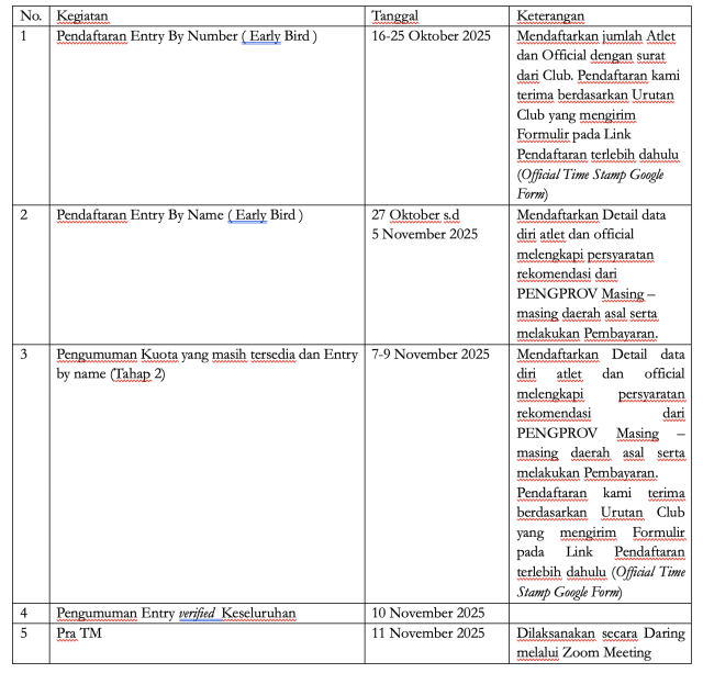 Pendaftaran Early Bird dimulai dengan input / entry by number dengan mengisi Link pendaftaran by nuumber dengan melampirkan formulir pendaftaran secara tertulis dari masing – masing club dan di upload scan pada link entry by number.